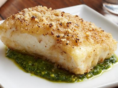 Spoon arugula pesto on the bottom of a large serving platter. Place crusted halibut on top and serve family style.